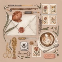 Archival giclee print of a collection of letter writing tools, flowers, coffee, and more, illustrated by Jessica Roux.