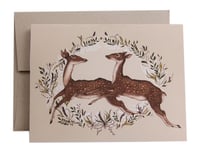Folding card featuring two jumping deer, illustrated by Jessica Roux. Perfect for telling a loved one you're thinking about them, wishing someone special a happy birthday, or anything you'd like.